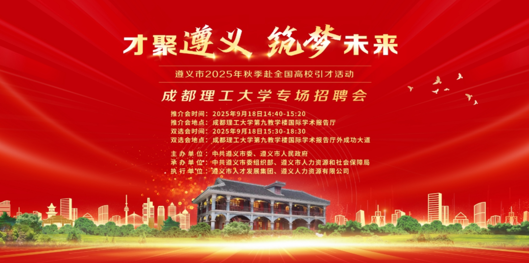 为深入贯彻习近平总书记关于做好新时代人才工作的重要思想,全面落实党中央和省委、市委人才工作决策部署,深入推进人才强市战略,切实做好赴全国高校引才工作,吸引更多高校毕业生来遵留遵就业创业,特开展“才聚遵义 筑梦未来”——遵义市2025年秋季赴全国高校引才活动。根据《遵义市2025年赴高校引才活动方案》总体部署,拟定于2025年9月18日在成都理工大学举办专场活动,诚邀各高校优秀毕业生参会!