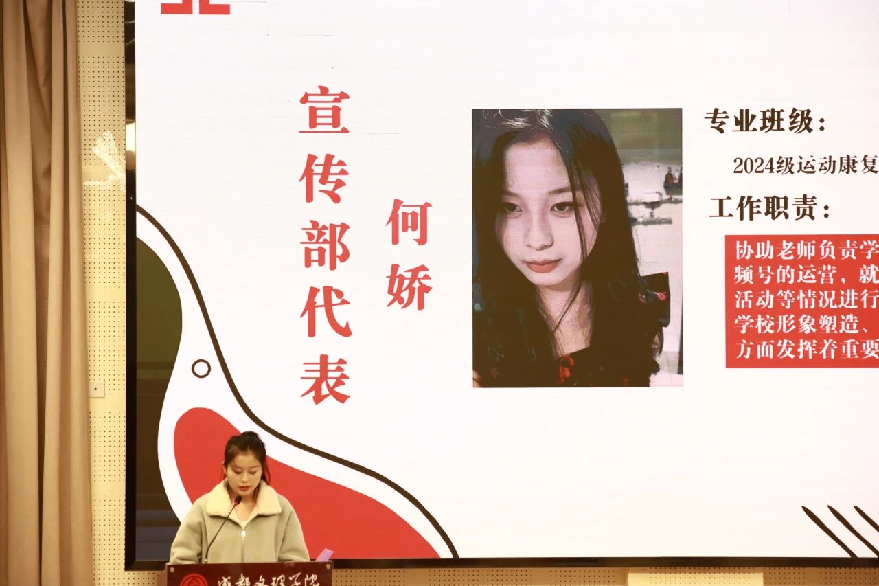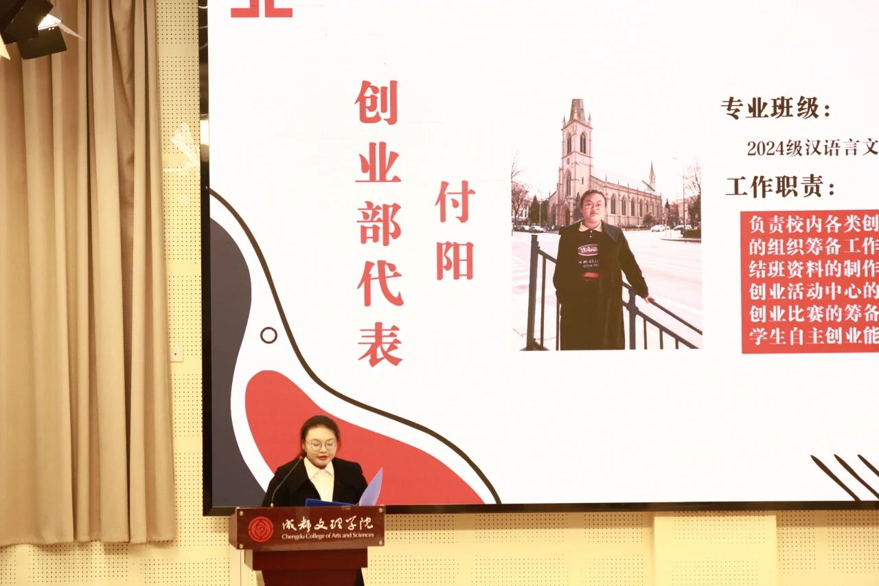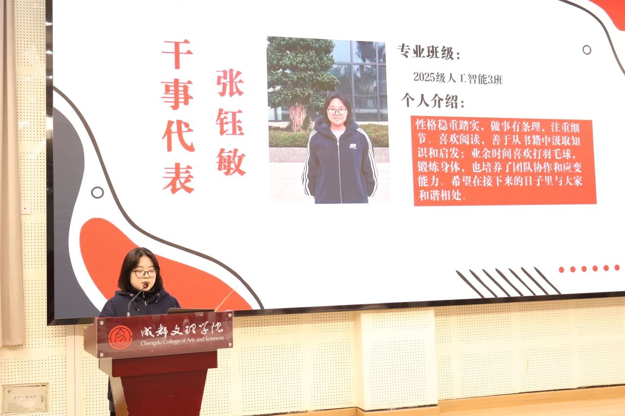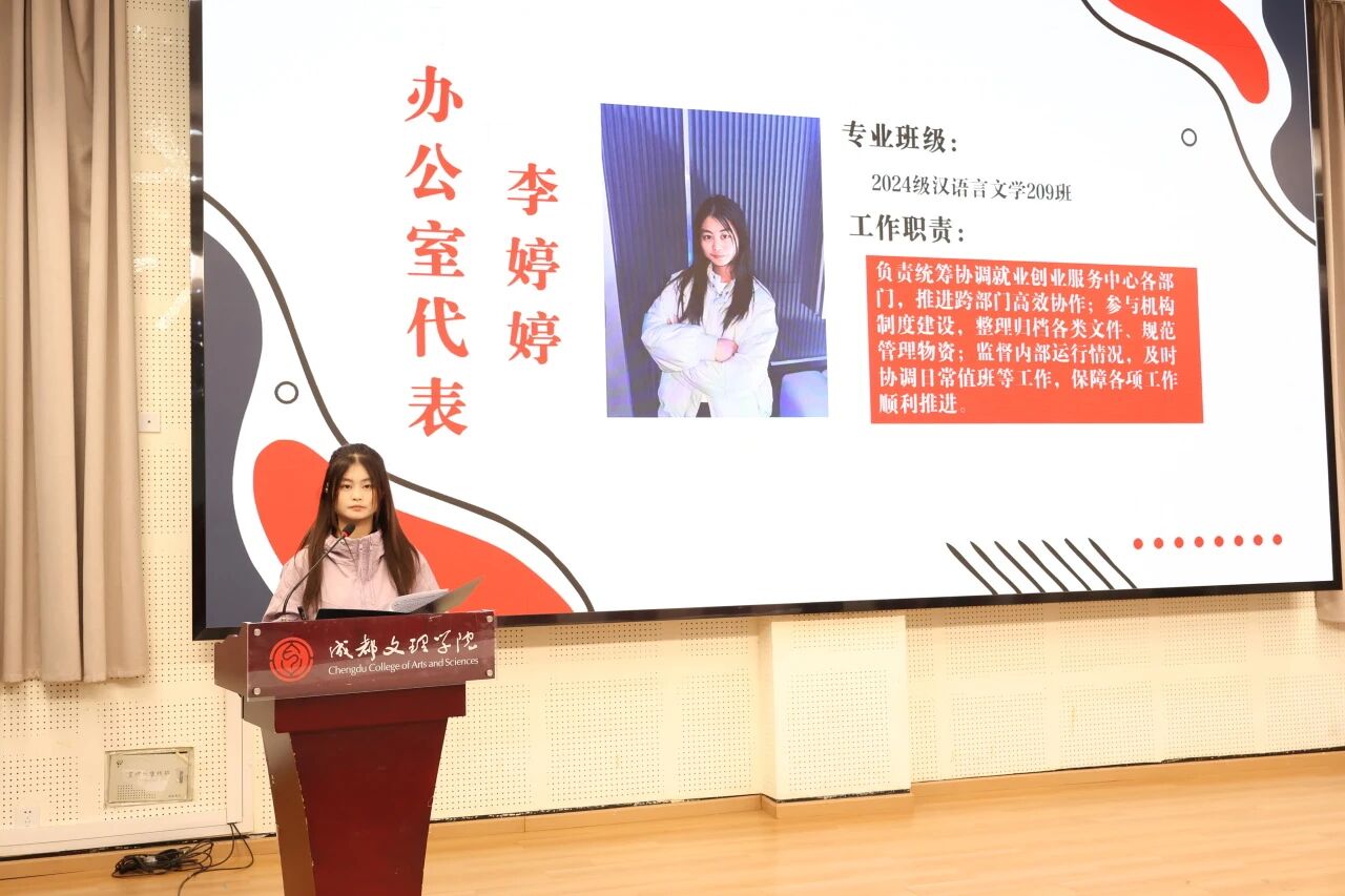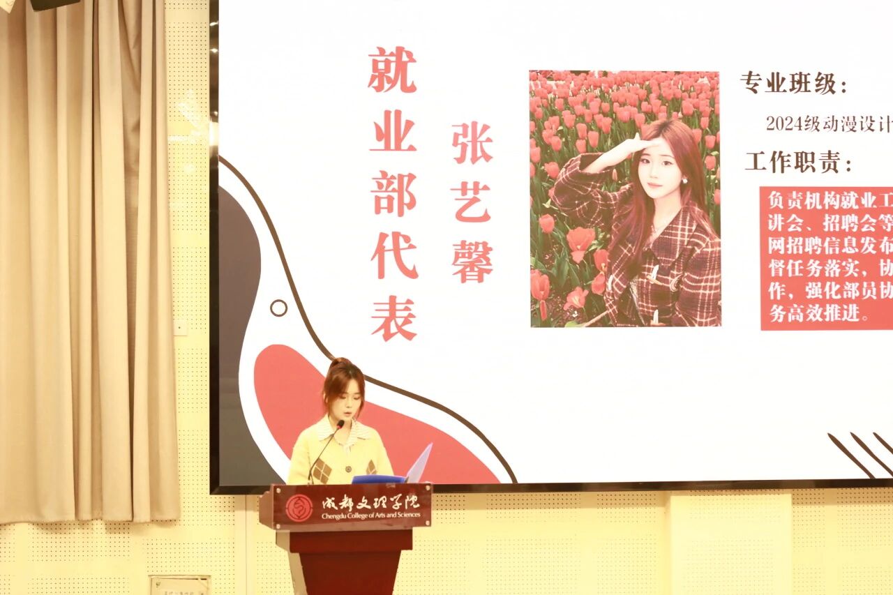 作为新干事代表,张钰敏以新生力量的身份发表感言:“很荣幸加入中心这个集体,我将以端正积极的态度全身心投入工作,始终秉持认真负责的职业作风,在团队协作中切实践行敬业精神。同时,我也满怀期待,希望在后续的实践锻炼中,能与全体成员同心聚力,深度融入‘就创大家庭’。我将以自信为基、以坚持为翼,持续提升自我,与各位同仁携手成长,共同成为更优秀的团队成员。”
