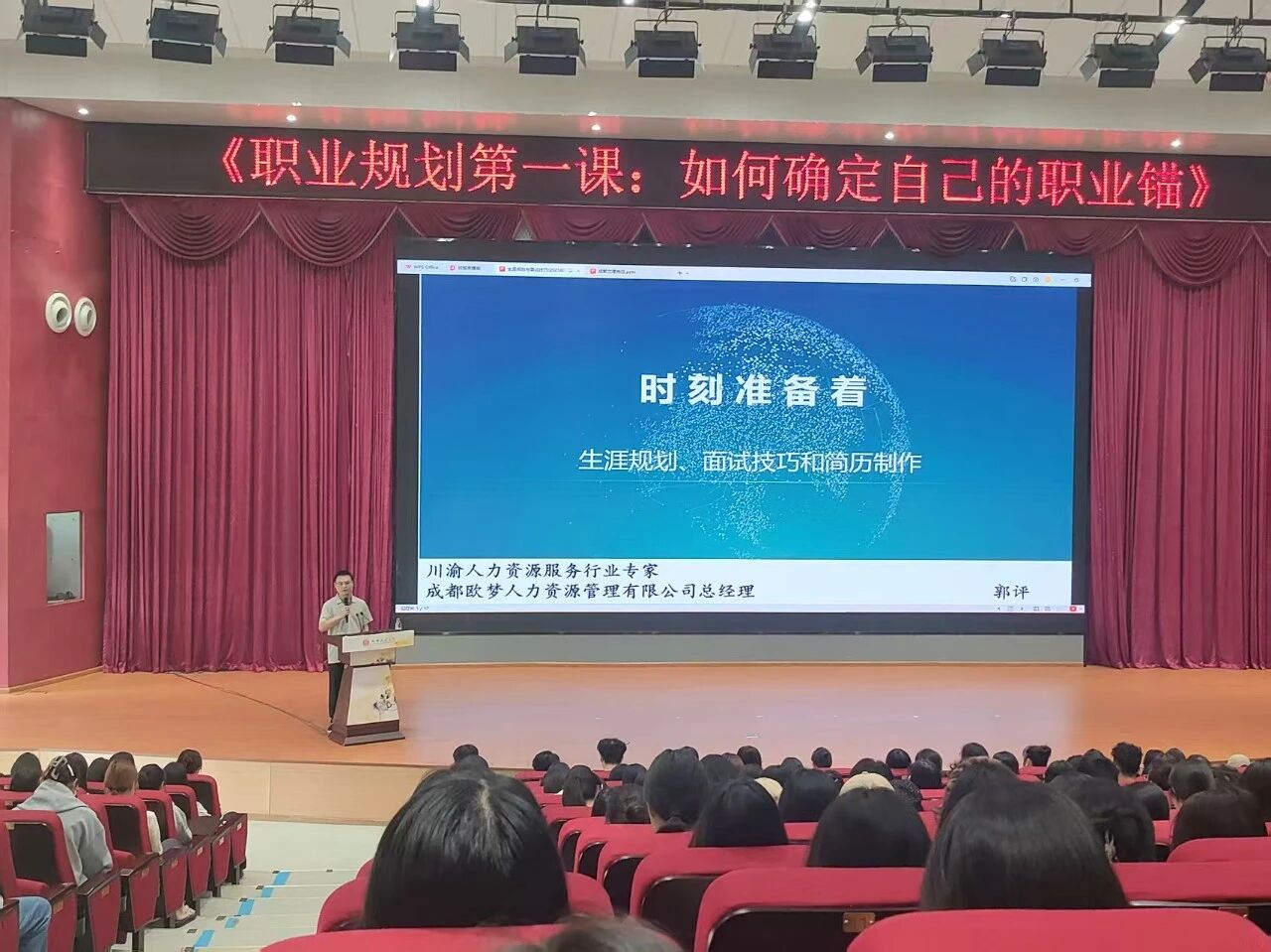为帮助学生明晰个人发展方向,提升职业素养与规划能力,10月15日上午,我校在文理讲堂举办“就业大讲堂”系列之《职业规划第一课:如何确定自己职业锚》专题讲座。四川省社科院—四川西部经济文化发展研究院生涯规划特聘教授、四川省人力资源行业服务协会副秘书长、弘德优才职业生涯规划首席专家郭评担任主讲,近500名会计学院2026届毕业生共同聆听。
