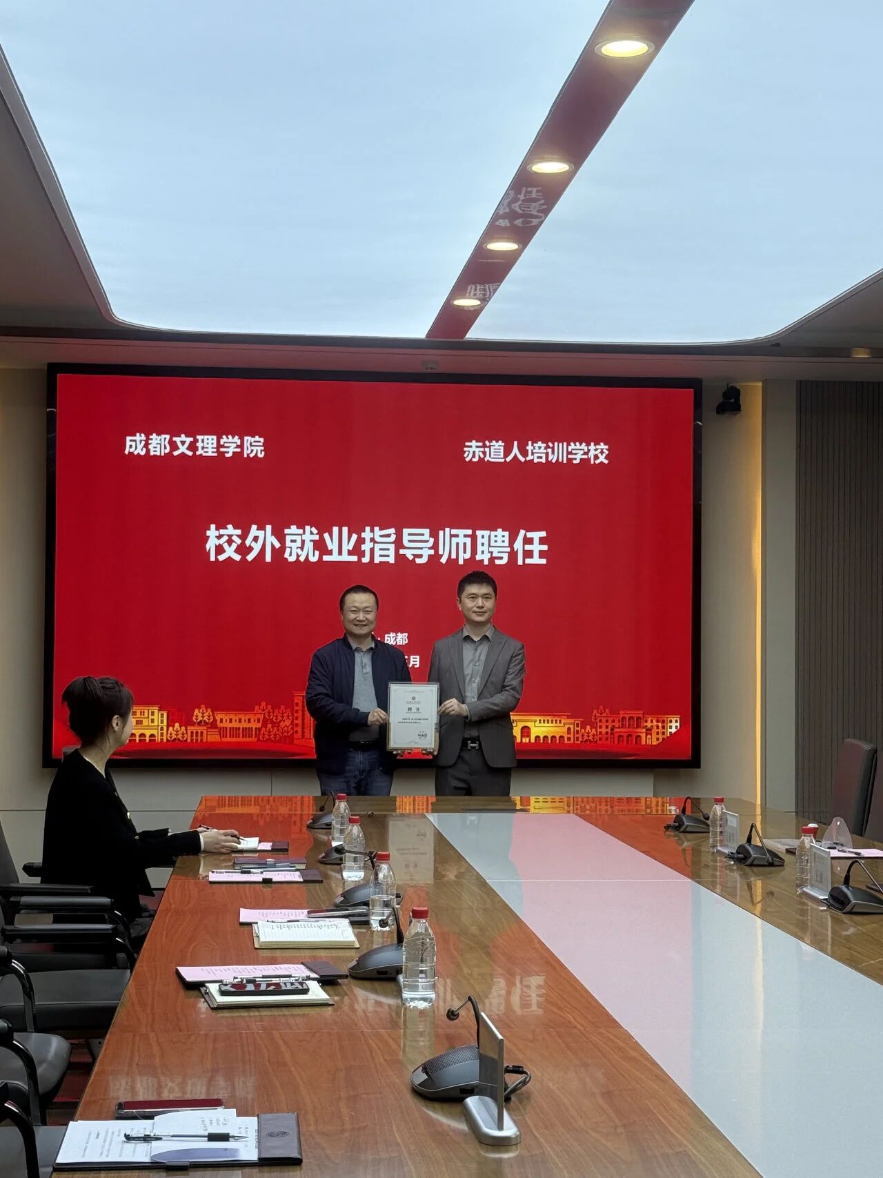 在双方深入交流、达成共识后,签约与授牌环节正式进行。郑巍巍代表我校,王波代表赤道人培训学校,分别签署了校企合作协议书,并完成授牌仪式,标志着双方校企合作正式启航。随后,王亚军为王波颁发就业指导校外导师聘书,聘请其为我校学子提供就业指导,助力学子明确职业方向、提升就业能力。