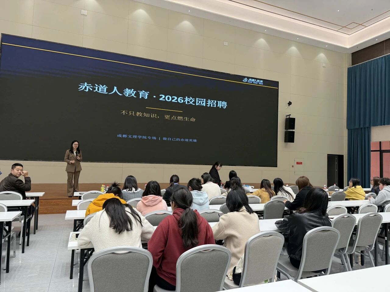 侯秀详细介绍了赤道人培训学校的发展历程、核心业务、企业文化及人才培养体系,让学子们全面了解企业的发展潜力与成长空间。此次宣讲会精准对接我校学子专业特点,重点开放了小/初/高中各科教师、学习规划师、新媒体运营、教务管理等多个优质岗位,为不同专业学子提供了多元化的就业选择。